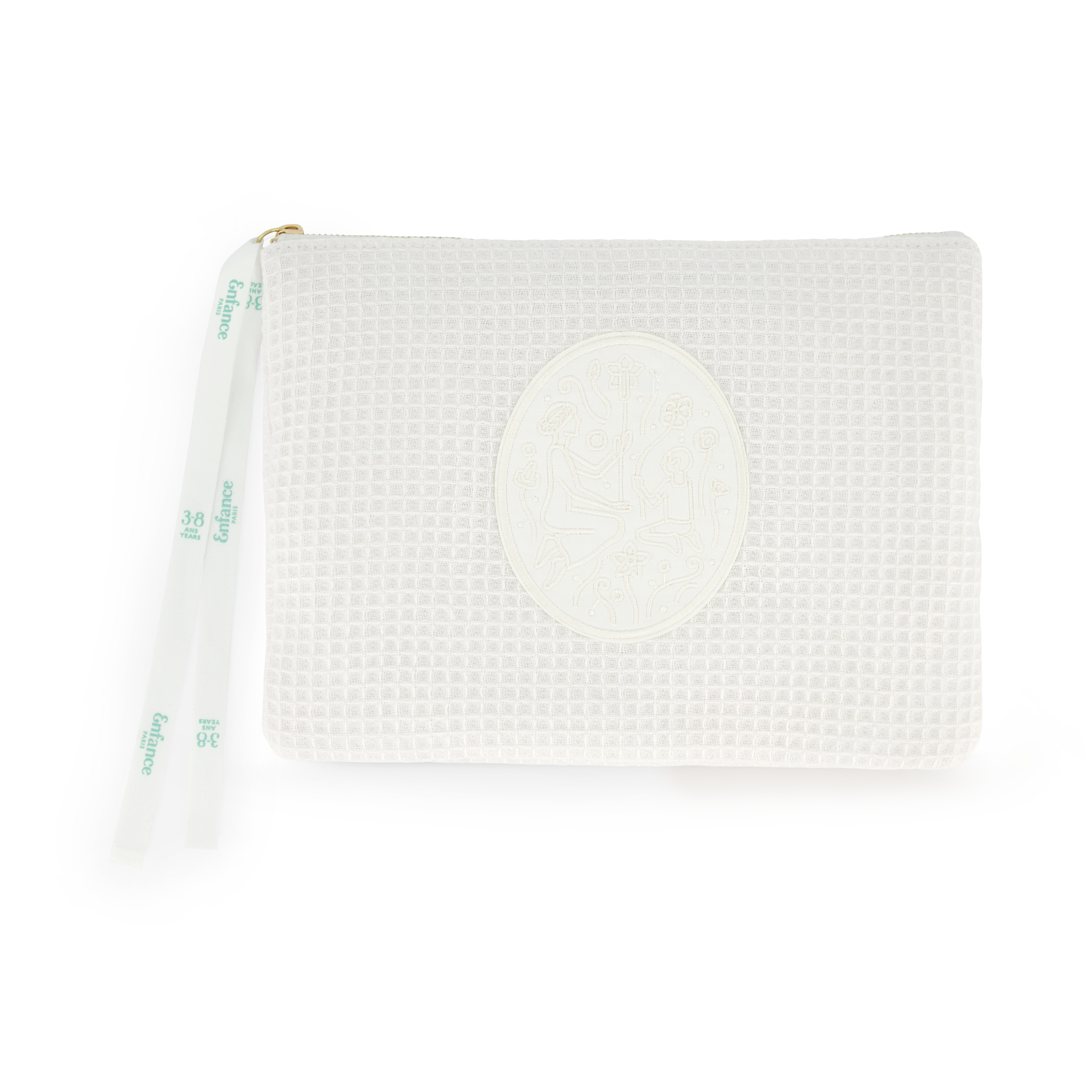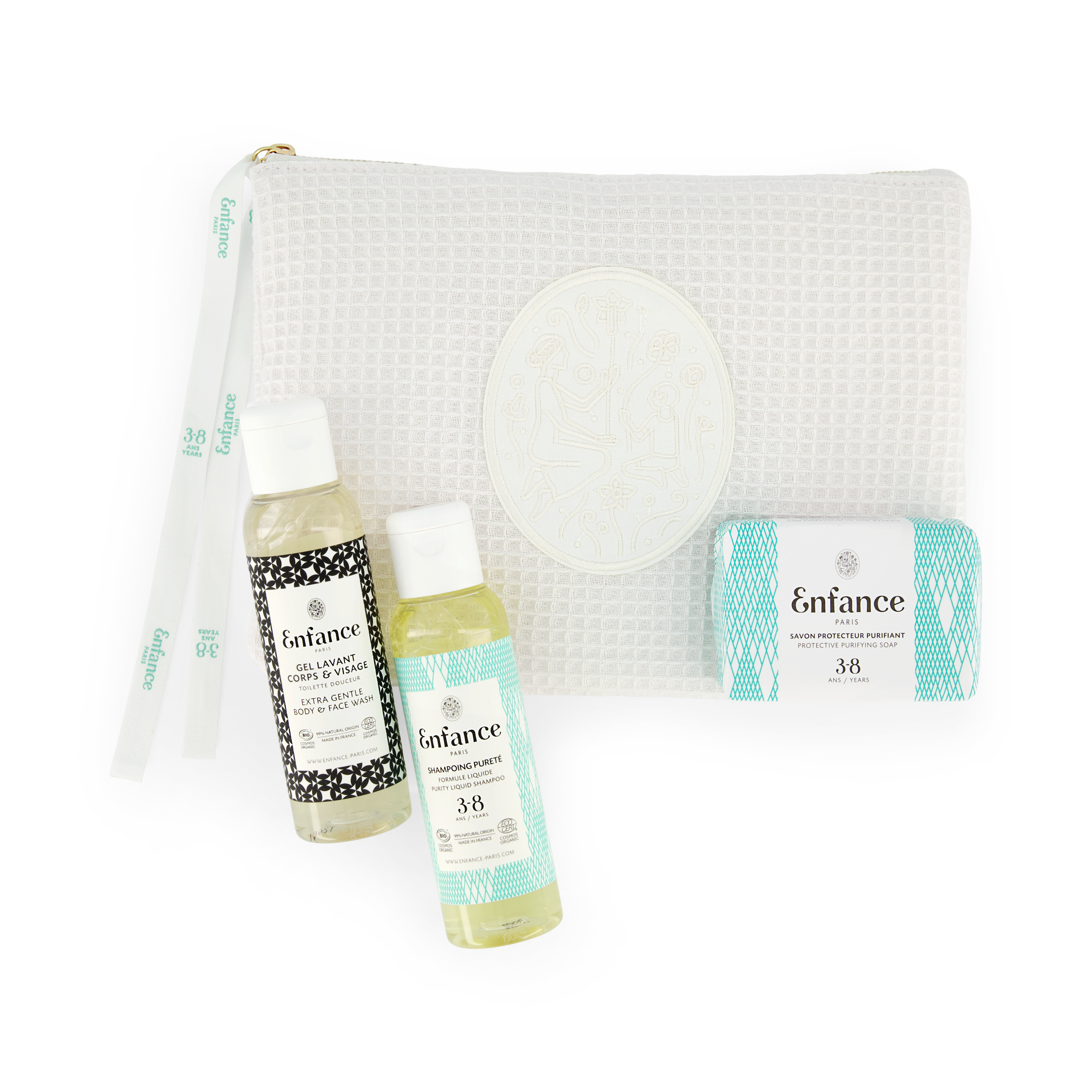 Η Enfance Paris έχει δημιουργήσει κατ’ αποκλειστικότητα ένα μαλακό τσαντάκι το οποίο αντικατοπτρίζει την ευγένεια της μάρκας. Ένα κομψό και διαχρονικό τσαντάκι ταξιδίου για τα προϊόντα φροντίδας του παιδιού αλλά και τα καλλυντικά ή τα κοσμήματα της μαμάς… Το σύμβολο της Enfance Paris, μία ποιητική εικόνα, βρίσκεται κεντημένη στο κέντρο, στο φωτεινό χρώμα του μελιού, κάνοντας αντίθεση πάνω στο λευκό βαμβακερό νεσεσέρ . Το φερμουάρ κλείνει με τη χαρακτηριστική κορδέλα που χρησιμοποιείται και στα σαπούνια της Enfance Paris, όπου διακρίνεται η ηλικιακή κατηγορία των προϊόντων που εμπεριέχονται στο νεσεσέρ.